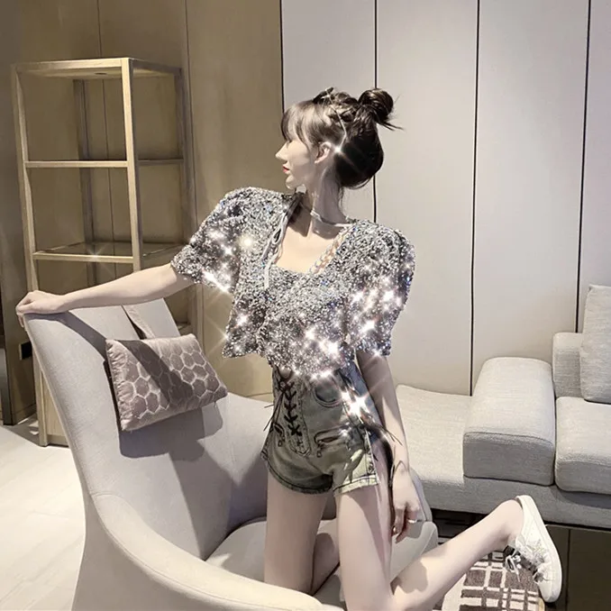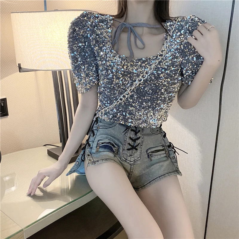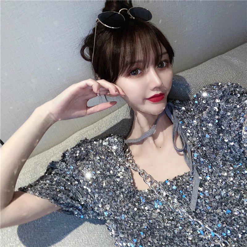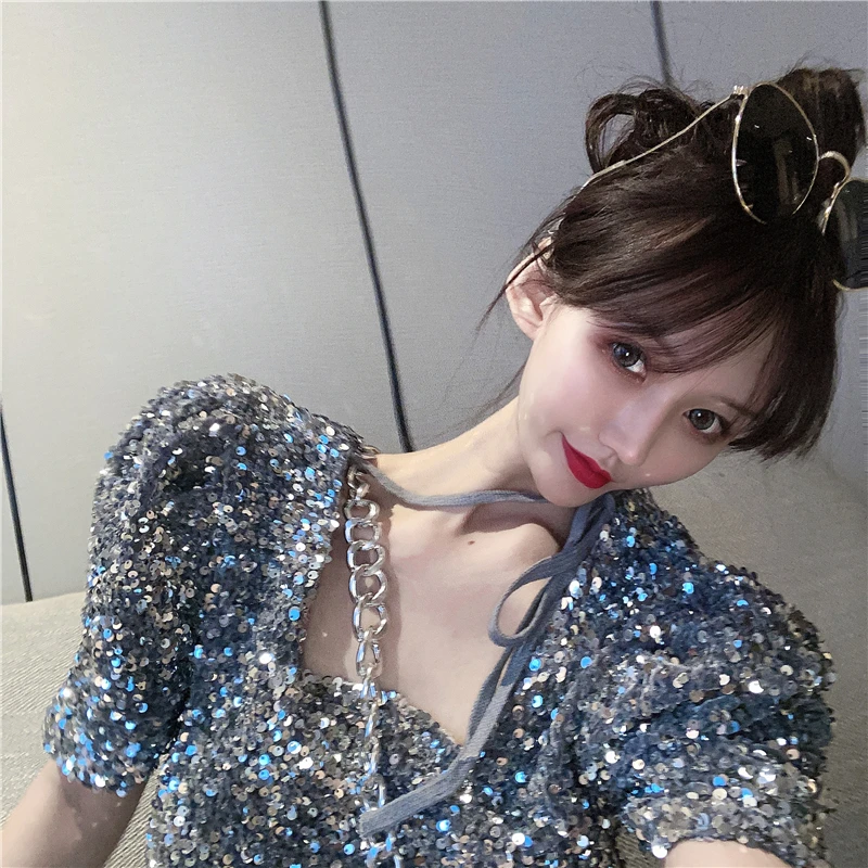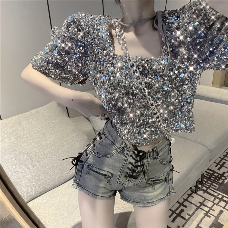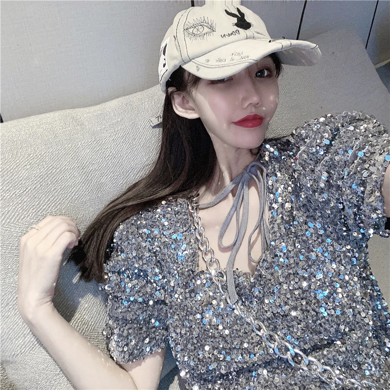 Club Full Sequined Silver Short Puff Sleeve Crop Top Sexy Square Collar Shiny T shirt Loose Sweet Korean Women Clothing Summer Women’s Dresses