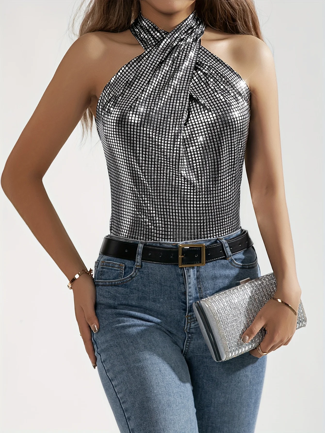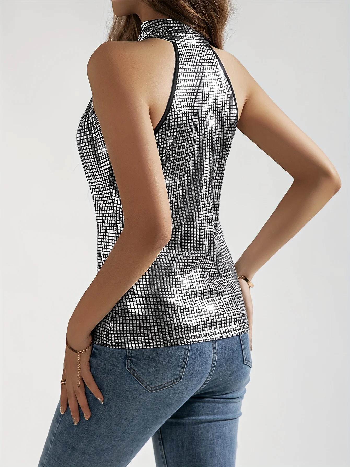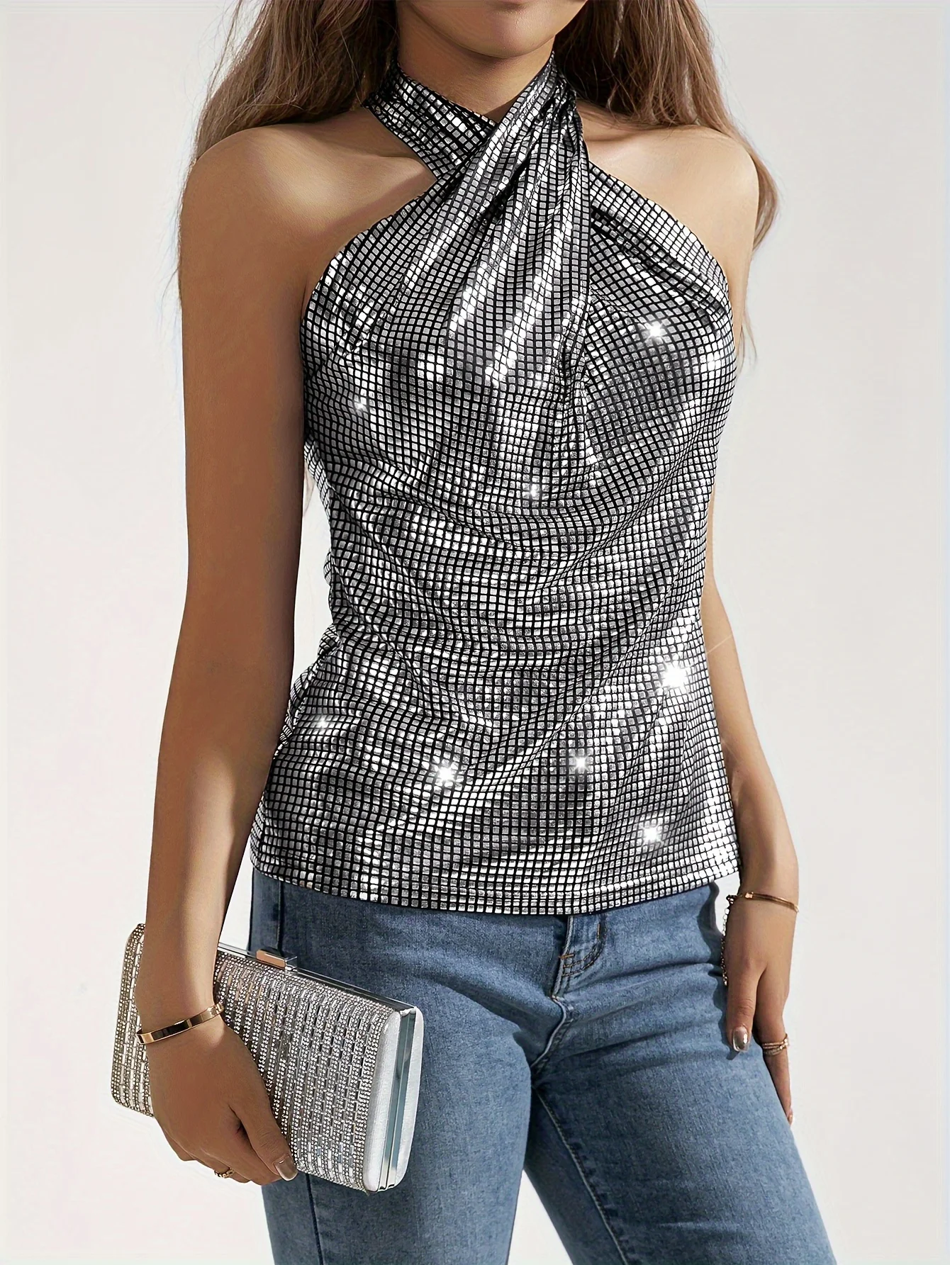 Silver Metallic Glitter Geo Pattern Crisscross Plaid Halter Top, Y2K Sleeveless Top, Evening Party Women's Clothing Women’s Dresses