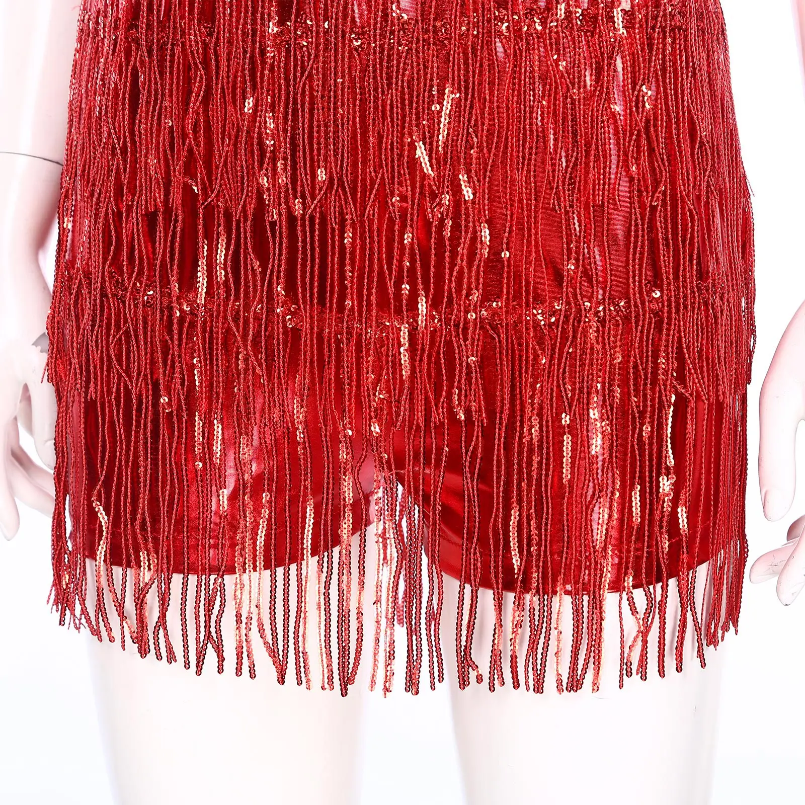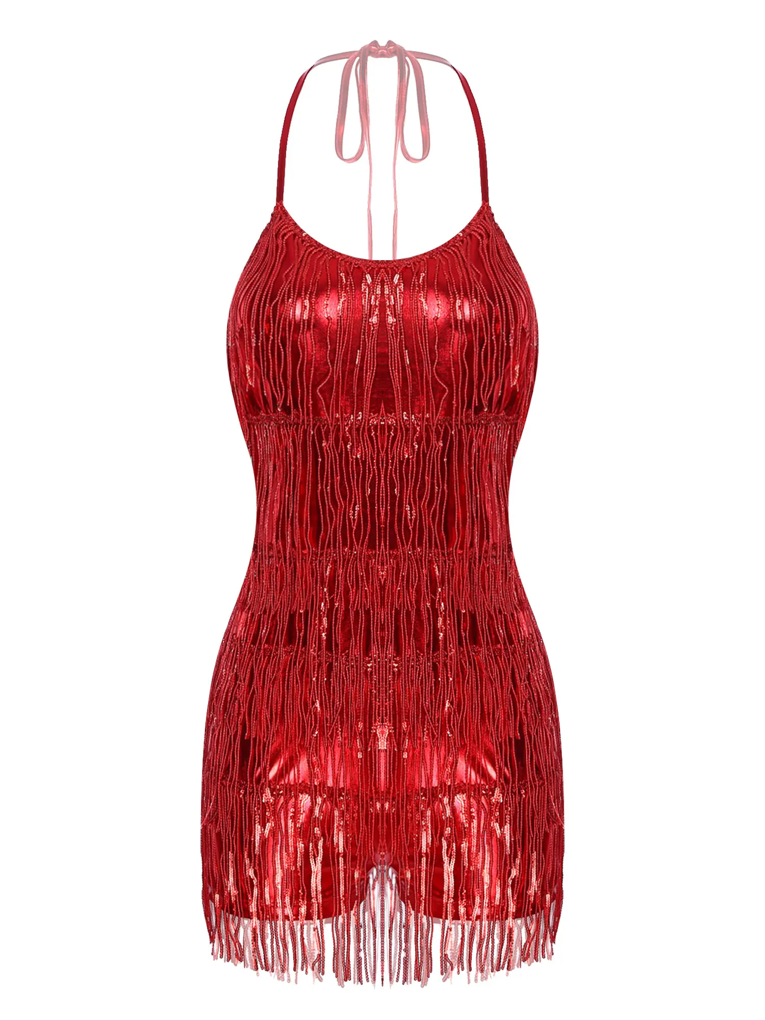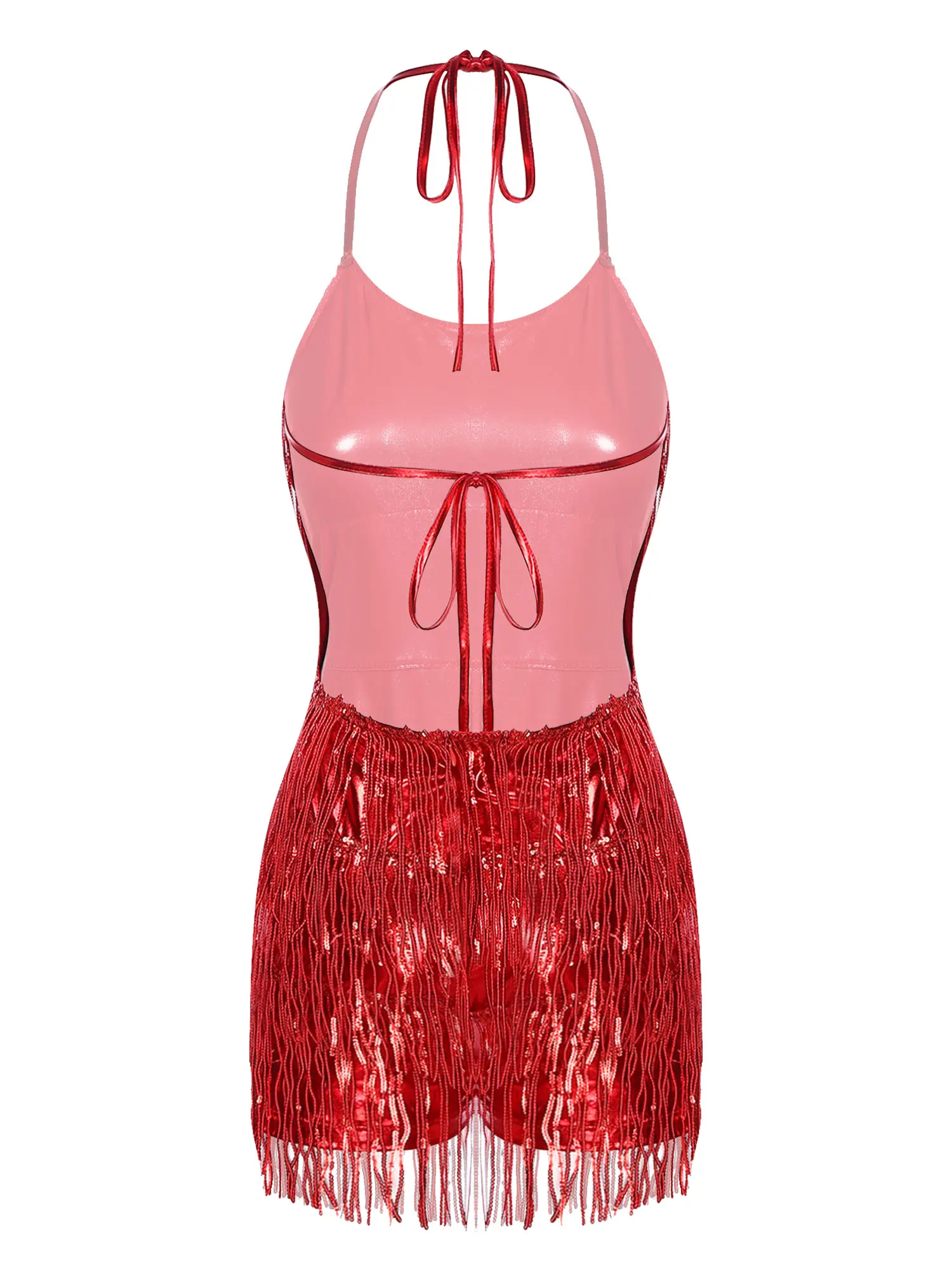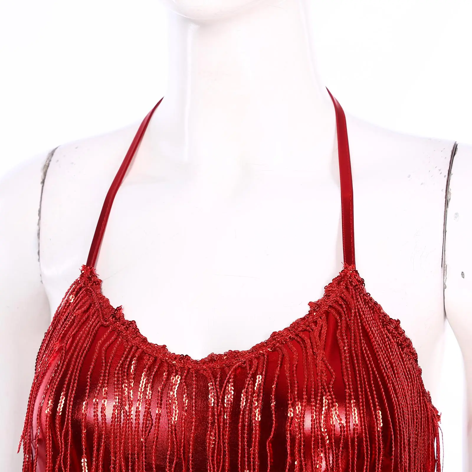 Womens Glittery Sequin Fringe Latin Dance Costume Samba Dress Rompers Metallic Jumpsuit Tassel Bodysuit for Stage Performance Women’s Dresses